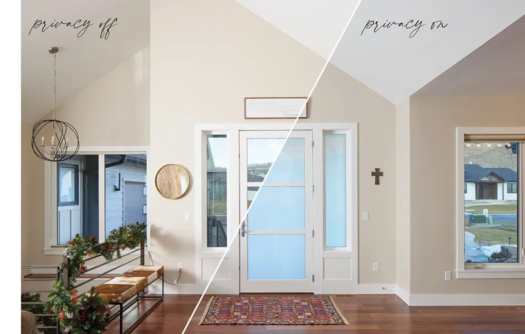Over at Silver Creek Trail, homeowner Neil Clark wanted something a little more high-tech. Their front entryway featured clear glass panels, great for daytime light, not so great when it came to nighttime privacy.