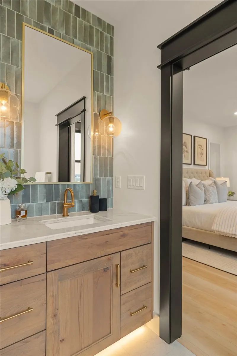“What I have found to be the more luxurious portion of this house is the master suite, and the way that the bedroom, closet, and bathroom flow together,” Minkoff said. Housed in the master suite is a reading nook with a built-in bench in the corner, and a closet with a washer and dryer set, separate from a dedicated laundry room on the second floor. In the center of the closet is an island that makes it easy to fold and store clothing. The master bathroom is a work of art, with coordinating tile for both the backsplash and shower, and splashes of timeless gold to pull the look together.