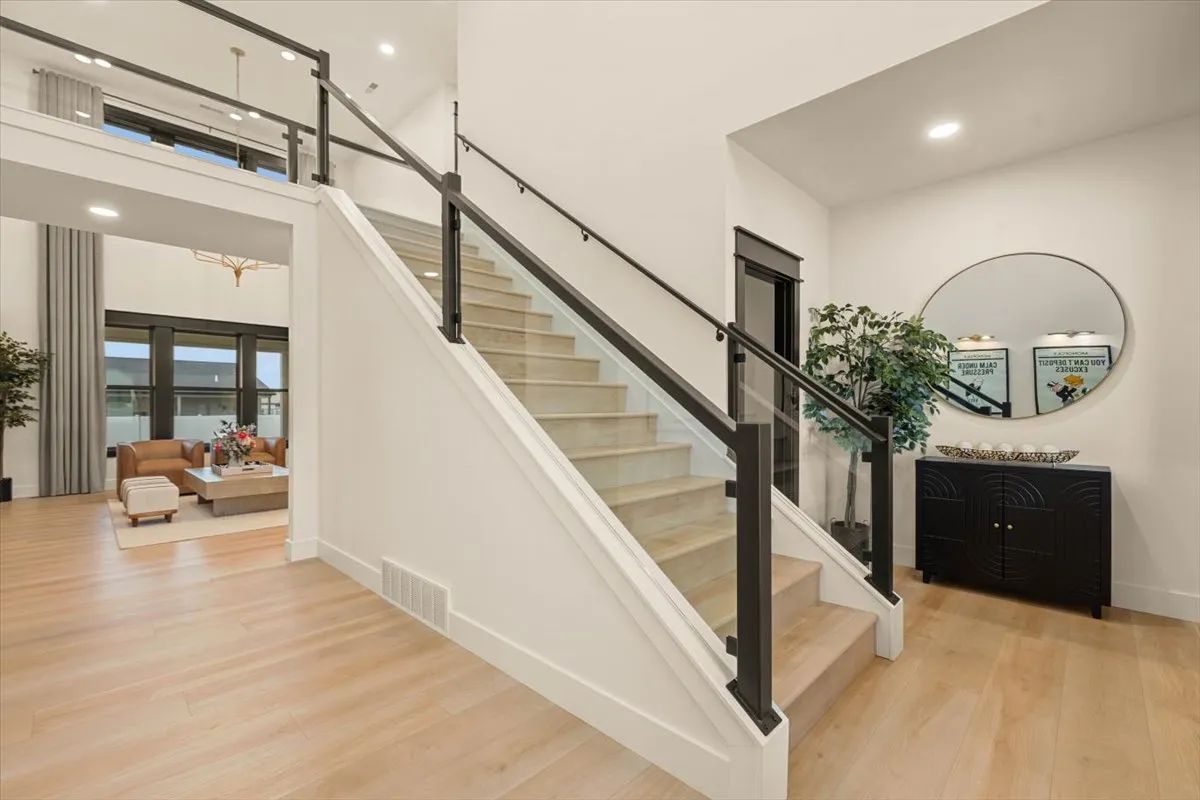After a successful Parade of Homes build in the Stone Creek subdivision on the corner of 64th and Neibauer, which won the People’s Choice Best Kitchen award, Minkoff completed another spectacular home at 2235 Smooth Rock Lane in the same subdivision. The home features a unique staircase with glassed-in railings, soaring 20-foot ceilings, and a glass-paneled bridge connecting the upper living room to the upstairs office.